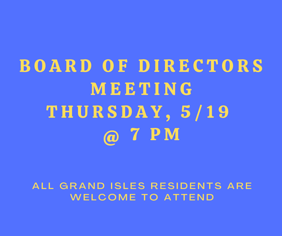 Board of Directors Meeting tonight at 7 PM in the clubhouse. All Grand Isles Residents are welcome to attend.