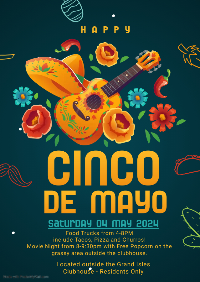 Cinco de Mayo celebration! Saturday at 4 PM, our community is coming together for an electrifying event that you won’t want to miss. Food trucks will be onsite for you to purchase delicious treats from 4 to 8 PM. From savory tacos to sweet churros, and even pizza, there’s something for everyone to indulge in.