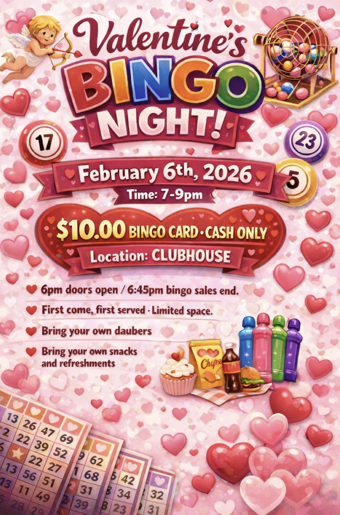 On February 6th at 7:00PM, the Social Committee will be hosting a Valentine’s Bingo Night at the Grand Isles Clubhouse.